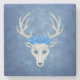 This stone coaster for your drinks is a misty blue colour with a mythical head of a white deer with antlers and blue roses on the top of its head.