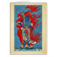 Mythological blue Buddhist or Hindu figure, full-length, standing on small island among waves, facing right, against backdrop of flames with phoenix head.