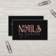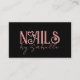 An editable nail tech business card template design, with a cute pink heart, social media handles and vintage and script typography on a black background.