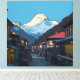 A vivid illustrated view of Namche Bazaar with Everest rising beyond the rooftops — crisp, text-free wall art that anchors travel-inspired interiors and boutique hospitality spaces.