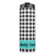 Stylish 12oz thermal tumbler featuring a black & white buffalo check pattern and turquoise accent frame for you to personalize. Change text to make it yours using the simple Template provided. Stainless body, plastic lid. Vacuum-sealed double walled construction retains temperature, hot or cold. Awesome gift for family, friends, actually-- anyone. See "About This Product" at side for more information and care.