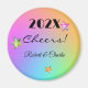 Colourful gradient rainbow background with bright stars, 202X year Cheers and ample room for your name(s) on this round button magnet. Ideal favour or giveaway on New Year's Eve. Easily change or remove name and update the year using the Template provided. Available in 3 round sizes; 1.25", 2.25" (shown) 3" and a 2" square shape. Printed on 100% recycled paper. Covered with scratch and UV-resistant mylar. See "About This Product" at side for more information.