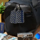 A modern and elegant dark blue tag personalized with her name. A simple and nice pattern of faux gold airplanes flying all over the navy blue surface... to easily identify your things.