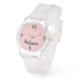 A sporty watch with durable clear silicone buckle strap and pale pink faux glitter face. Name is a bold black script font. Easily change name, replace with monogram initials or remove to make it yours using the Template provided. Choose from other styles and colours.