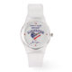 This sporty 80s style watch with durable clear silicone buckle strap features "Happy 250th Birthday America, heart shape rustic USA flag motif, handwritten name all in dark blue and small subtle numbers in red. These were called "Jelly watches" in the 80s. Easily change or remove the name using the Design Tool provided. White and black silicone straps are also available along with 15 other styles. See "About" for more information.