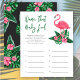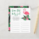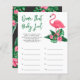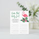 Baby shower invitation design features pink flamingo with lush green palm leaf fronds and tropical hibiscus flowers. "Aloha Baby". A tropical floral pattern with black background colour dresses up the back of the card.