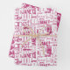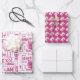 Typography wrapping paper that can be personalized name and age/number. Sheet 1 features a name word cloud in pink on a white background. Sheet two is pink with a pattern of the number 25 and sheet three is solid white. Make your give extra special with this wrapping paper design.