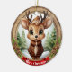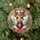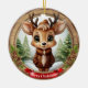 Name Whimsical Reindeer Rustic Holiday Tree ceramic ornament! Xmas Deer Antlered Animal Character decoration Featuring customizable white text saying "Merry Christmas" on a vibrant red ribbon – easily swap it out for a loved one's name to make it truly personal gift tag. Round framed, brown wooden style with charming accents of pine cones and evergreen branches for that cozy, woodland vibe. At the center is a cute, whimsical reindeer in cartoon graphic style, dressed in a brown coat and hat, evoking the spirit of wildlife with a festive twist. The background showcases an enchanting winter wonderland scene complete with a snow-dusted trees, capturing the joy of the winter season. This two-sided, personalizable decor ensures festive charm from every angle – the delightful illustration appears on both front and back, so it always looks complete no matter how it spins while hanging. Perfect for gifting or decorating, and you can transfer this unique design to a variety of other products, from mugs to cards and more! Personalize your pinecone decor and bring home this delightfully unique keepsake today – visit Zazzle to customize and order now!