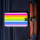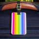 Bright rainbow stripe luggage tag in pink, orange, yellow, blue, green, purple. Customize the reverse of this tag multi coloured tag with your name and address details. Pattern and tag by Sarah Trett.