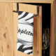 An stylish zebra print kitchen towel in black & white with a silver-design nameplate, personalized with your name or text. (The nameplate is a printed illustration. Not reflective or real silver.)