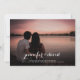 These elegant save the date cards feature your names in modern white calligraphy, over your favourite personal photo of the two of you. The back of the card features black and white polka dots.