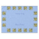 Une paire de bleuets de l'est font leur maison dans une mignonne maison d'oiseaux jaunes dans un beau jardin de printemps rempli de marguerites bleues et jaunes et entouré de bois de chien en fleurs. Des papillons orange et bleus viennent également visiter les fleurs. Le tout sur un arrière - plan à motifs bleus assorti.