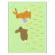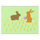 Cette superbe nappe est dotée d'une paire de mignons petits lapins de Pâques entourés de fleurs de jonquilles jaunes. Les lapins sont bruns avec de grandes oreilles, des yeux noirs et des queues blanches moelleuses. L'un des lapins tient un oeuf de Pâques avec un joli arc violet dessus et tente de l'offrir à l'autre lapin. Les jonquilles sont jaunes avec un centre orange vif.