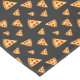 Des tranches de pizza cool et amusantes motif sur une nappe gris foncé pour la soirée pizza d'anniversaire. Pizza juteuse à croûte croquante, fromage, salami, champignons champignon, olives et une saupoudrée d'origan.