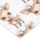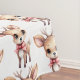 A tablecloth with an illustration of an adorable baby deer. Big eyes big ears with a large head and little brown antlers. Wearing a big red bow.