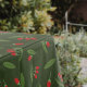 Une nappe avec une illustration de baies de goji sur un arrière - plan vert foncé : un joli cadeau pour une personne qui vient de déménager ou pour votre décoration de maison!