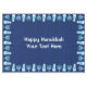 Cette coutume d'une nappe de 60 pouces sur 84 pouces habillera la table Chanukkah pour le dîner ou une fête. Une rangée d'hommes de neige portant des foulards de l'Étoile de David et des Kippahs assortis au symbole traditionnel de l'Hanoukka Menorah forment une bordure autour de cette nappe joyeuse. Les rayures bleu marine feront apparaître votre texte blanc ou le commander sans texte si vous le préférez. Des assiettes de coordination, des assiettes de service, des serviettes et d'autres objets de décoration de fête du Festival des Lumières sont disponibles.
