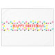 Happy Birthday est écrit en rouge dans le centre du tissu blanc de la table de fête. Pois colorés tendance rose, bleu turquoise, jaune et noir. Motif géométrique à la mode et lumineuse. Conception originale © TamiraZDesigns.