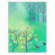 Peinture de deux oiseaux noirs dans un champ vert au printemps. Un hérisson arrive en feuilles et est parsemé de fleurs, et dans l'arrière - plan il y a des arbres au bord de la forêt. Art original de Nic Squirrell.