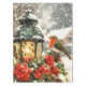 Une lanterne brillante ornée de feuilles saints, de roses délicats et d'un oiseau charmant, le tout entouré de flocons de neige qui tombent doucement.