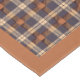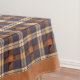 Ce chiffon de table Thanksgiving a brun et bleu plaid avec feuilles et citrouilles d'automne et une bordure correspondant au plaid.