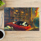 Introducing our Scholar Cat: A Quiet Moment in the Library jigsaw puzzle! This 1000 piece puzzle is perfect for adults who love a good challenge. The puzzle features a cute black and white cat peacefully napping in a scholarly library, bathed in warm lantern light. The intricate details of the fluffy cat, the vibrant red cushion, and the towering bookshelves make this puzzle a joy to assemble.