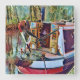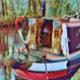 A pretty art design of a narrowboat moored in a peaceful part of the canal.