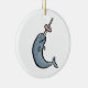 Here we see a cartoon narwhale playing with a pink iced doughnut.