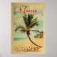 A uniquely retro mid-century modern Nassau Bahamas art print in vintage travel poster style. It features a curved palm tree on sandy beach with ocean under a blue cloudy sky.