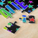 This vibrant and exciting birthday-themed jigsaw puzzle design has the message "HAPPY BIRTHDAY, NATALIE" with the characters having a colourful rainbow spectrum inspired gradient pattern, along with a fun field of stars background pattern. A colourful puzzle like this might be a fun way to send birthday greetings to somebody named Natalie. [~Z0000468]