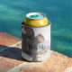 Modern wedding can cooler favours featuring a simple and minimal design with your monogram in a bold font along with your names in an elegant handwriting script and your wedding date over your favourite photo.