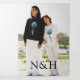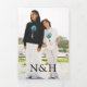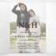 Modern all in one tri-fold wedding invitation featuring a simple and minimal black and white design with your monogram in a bold font along with your names in an elegant handwriting script over your favourite photo. The inside left panel has your additional details and optional QR code (if you prefer, you may remove the QR code in the design editing tool). The right panel has your RSVP card. The front cover and back each have a photo, for a total of three pictures.