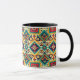 Native American, Aztec design mug features a geometric pattern of diamond shapes in turquoise blue, rust, orange, tan and black. It's bright and colourful and the perfect pick me up mug for your coffee in the morning! It's shown with a black inside and handle, however there are other types of mugs available to choose from.