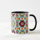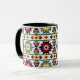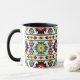 Native American, Aztec design mug features a vibrant starburst pattern. Colours are dark green, blue, black, rust, orange, yellow and white. It's bright and colourful and will bring a big splash of colour and energy to your day! It's shown with a black inside and handle, however there are other types of mugs available to choose from.