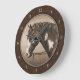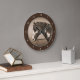 Beautifully painted portrait of a Native American chestnut pinto horse decorated with war paint symbols, feathers, and braided leather reins, in monochrome sepia tones to created an old or aged photo effect.