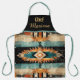 Striking Native American Southwest design apron in shades of tan, orange, blue and black. Bib of the apron is personalized with your name.