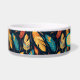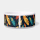 Bright and colourful Southwest, Native American Style pet bowl features turquoise blue, orange, yellow and rust coloured feathers against a black background. In the centre is a peach coloured banner where you personalize with your dogs name.