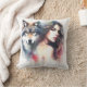A Native American woman stands confidently next to a majestic wolf, showcasing their deep connection and shared spirit in a vibrant, artistic setting.