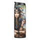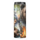 This powerful image portrays a captivating interaction between a young indigenous woman and a large grizzly bear. The woman, with long dark hair and striking green eyes, is adorned with traditional-inspired jewellery and a feathered headdress with blue and orange accents. She sits cross-legged near a small campfire, while a fierce-looking grizzly bear with bared teeth stands close behind her. The design tool can also be used to add custom text if you want your name or to any colour you desire by going into the design tool.