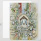 The design features a vintage-inspired background of distressed paper, sheet music, and rustic stamps, giving it an authentic aged feel. The centerpiece is a snowy Nativity scene framed by a gorgeous, elaborate wreath.