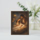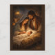 This postcard depicts a serene and humble moment in the stable, with the warm glow of a lantern illuminating Mary, Joseph and the newborn baby Jesus resting in the manger.