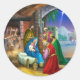 Nativity of Jesus with Jesus in manger. Mary and Joseph sitting next to crib