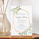 Beautiful gender neutral baby shower invitations feature grey lettering framed by a faux gold geometric border and light green watercolor foliage, leaves, and white berries. A modern choice in a natural colour scheme for boho or nature themed baby showers.
