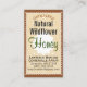 Geometric lattice pattern with a detailed border in warm hues for a beekeeper business card that matches honey jar labels with the same design. Edit the type of honey and product features in round text. Add the name of the employee, apiary name, and contact information on 3 or 4 lines of text (keep a blank space on the line below/above text for alignment). © dotpattern