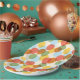 This party plate features a pattern of translucent birthday balloons in nature inspired and gender neutral hues to coordinate with your theme of the great outdoors and across all aspects of your birthday party celebration.