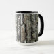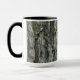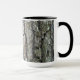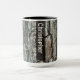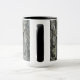 Opposite of mug's handle, there is a vertical semitransparent name banner. Banner is black and text is light. Text can easily be customized or rearranged. You can also adjust text font, size and colour.