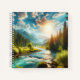 This spiral notebook has a calm type of illustration showing nature with the sun shinning. It has a river and distant mountains.