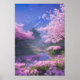 Cherry blossom trees bloom around a small pond, with delicate pink petals gently drifting on the water's surface. In the distance, majestic mountains complete the natural panorama, making for a breathtaking sight. This digital artwork captures the essence of the beauty of the cherry blossom season and the serene tranquillity of nature, offering a moment of contemplation and appreciation for the natural world.