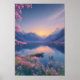 Behold the beauty of nature with this stunning digital artwork. A beautiful mountain lake sits in the centre, surrounded by pink flowers in the foreground. In the distance, majestic mountains rise, with the sun setting behind them. This piece captures the essence of nature's beauty and creates a sense of calm and tranquillity. Bring the majesty of the great outdoors into your living space with this beautiful artwork.