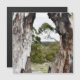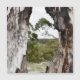 This image, taken at Loddon in Victoria, Australia, depicts a close-up of a hollowed-out or partially burned tree trunk, framing a lush, green landscape in the background. The tree’s bark has a mix of blackened, charred areas and smooth, light-colored wood, possibly due to fire damage or natural decay. Through the opening in the tree, rolling hills covered in greenery and scattered trees are visible. The overall effect creates a natural frame, adding depth to the composition, with the contrast between the rough, textured bark and the soft, distant landscape.